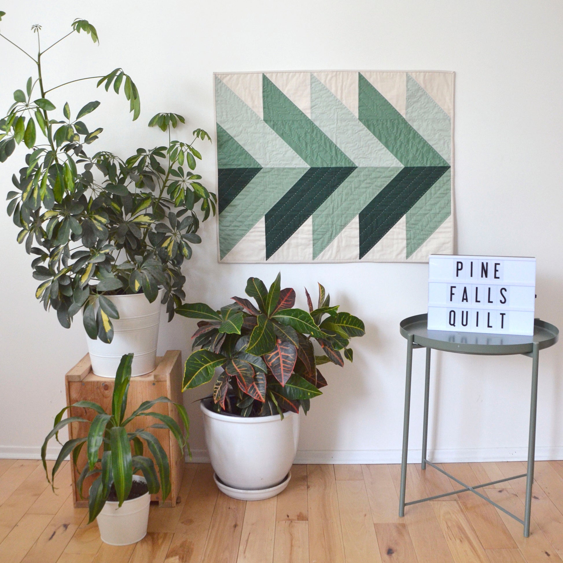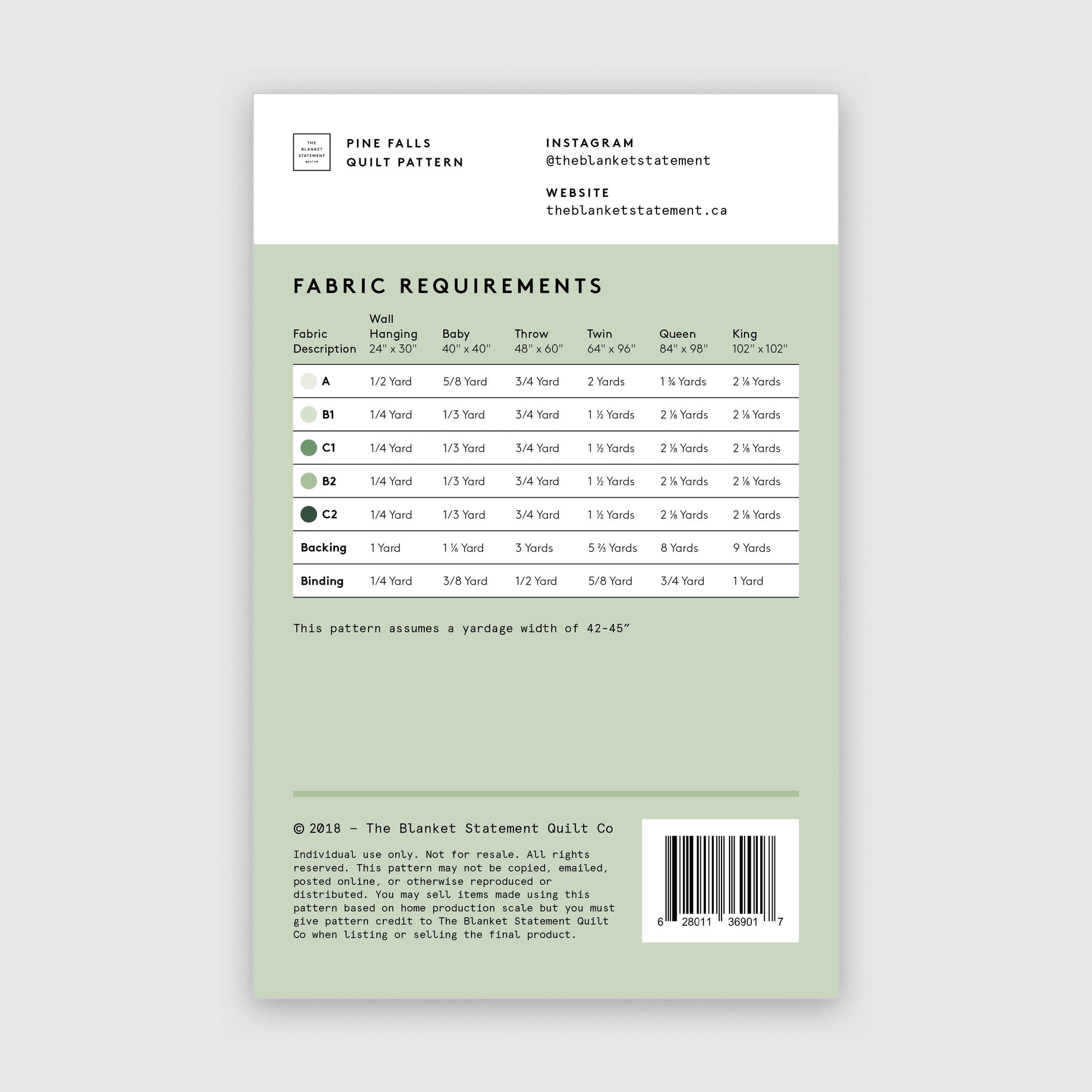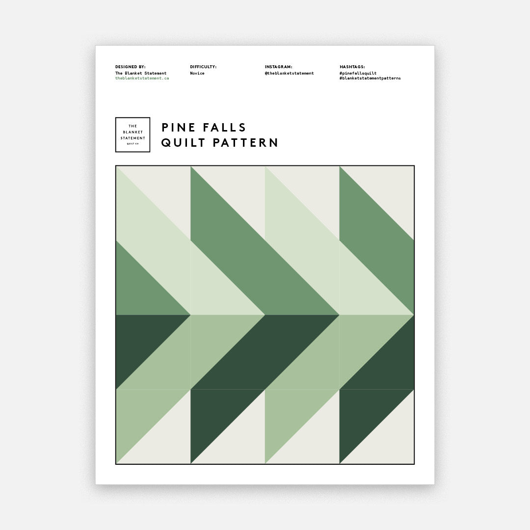 This minimal and modern original quilt pattern is appropriate for quilters of all skill levels and is a fast finish. Inspired by the great Canadian wilderness, this design is a nod to both the towering pines trees and cascading waterfalls.