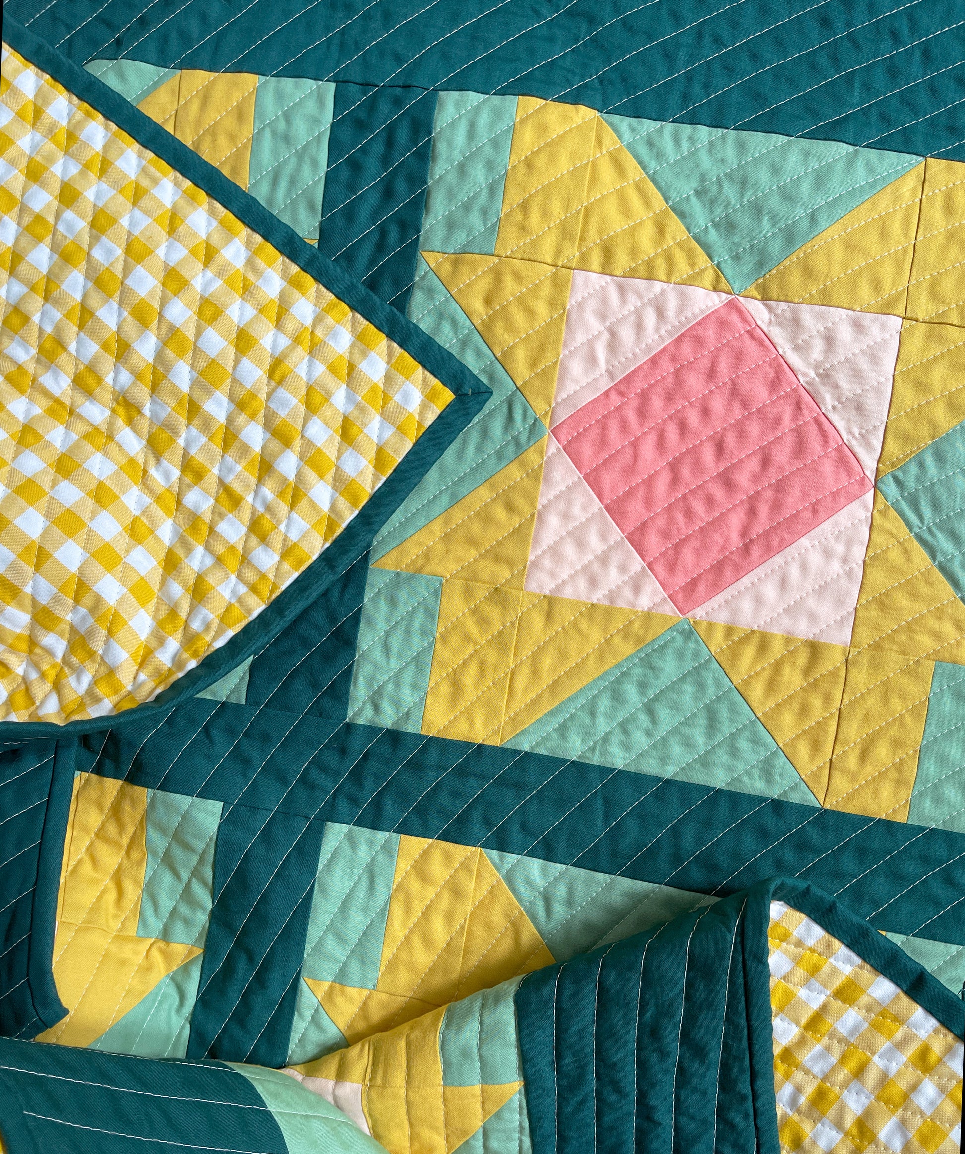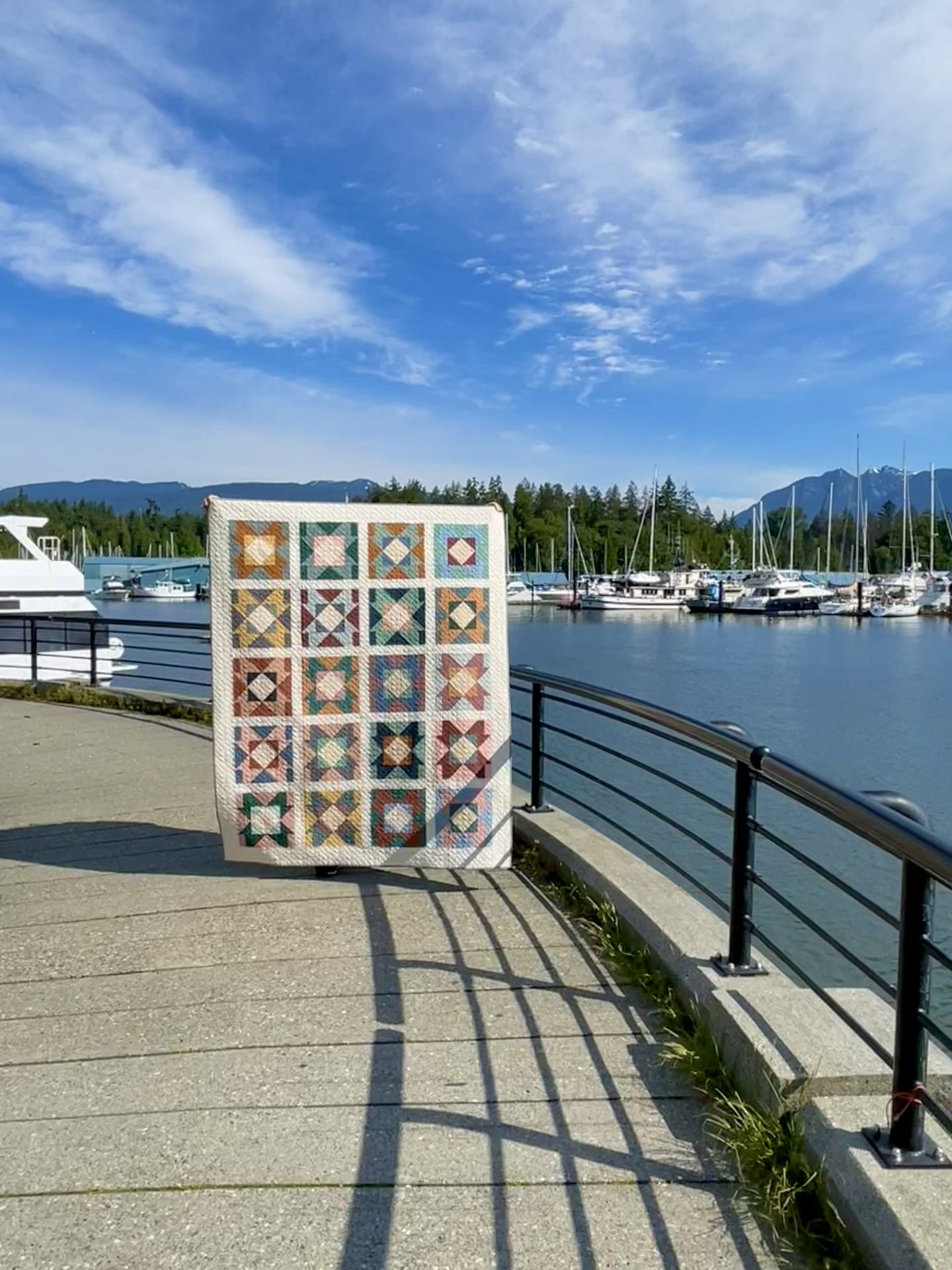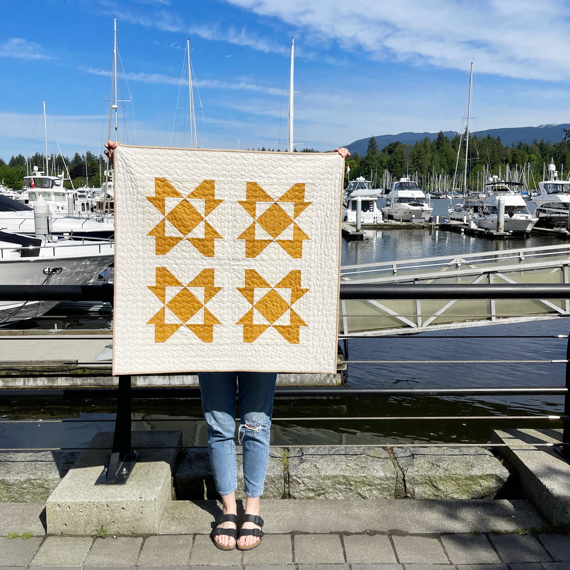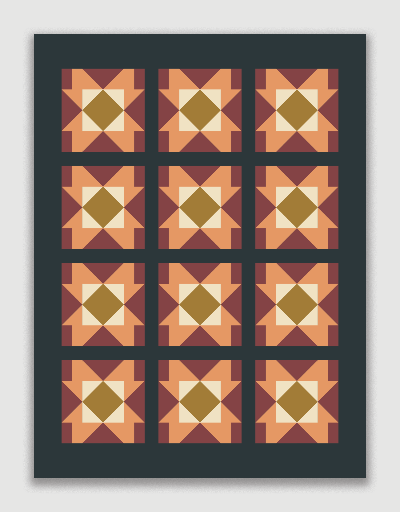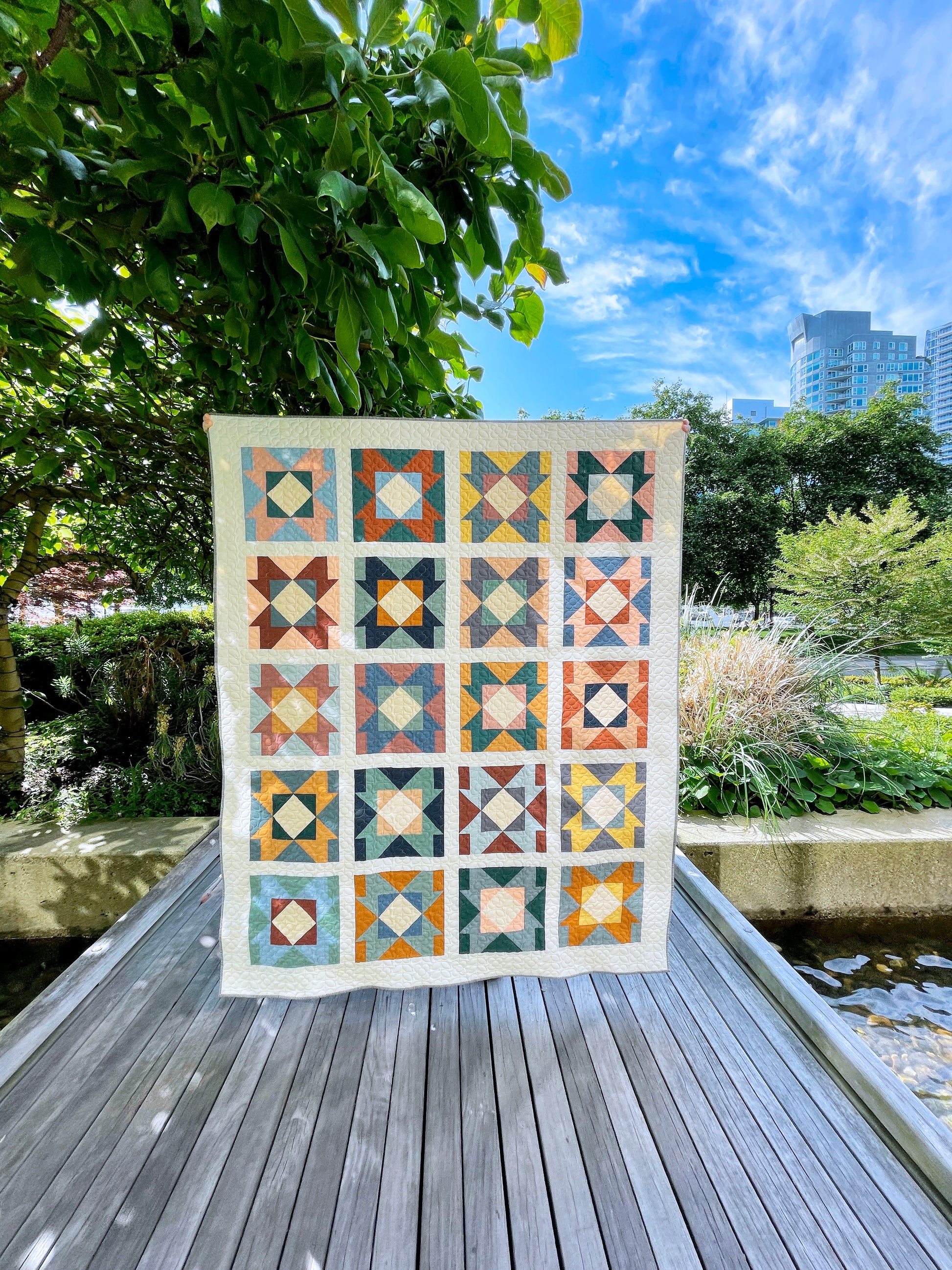 This modern, original quilt pattern is appropriate for intermediate quilters (or confident beginners!). This pattern utilizes a 12" block design and offers a 5-colour, 2-colour and FQ-friendly layout.