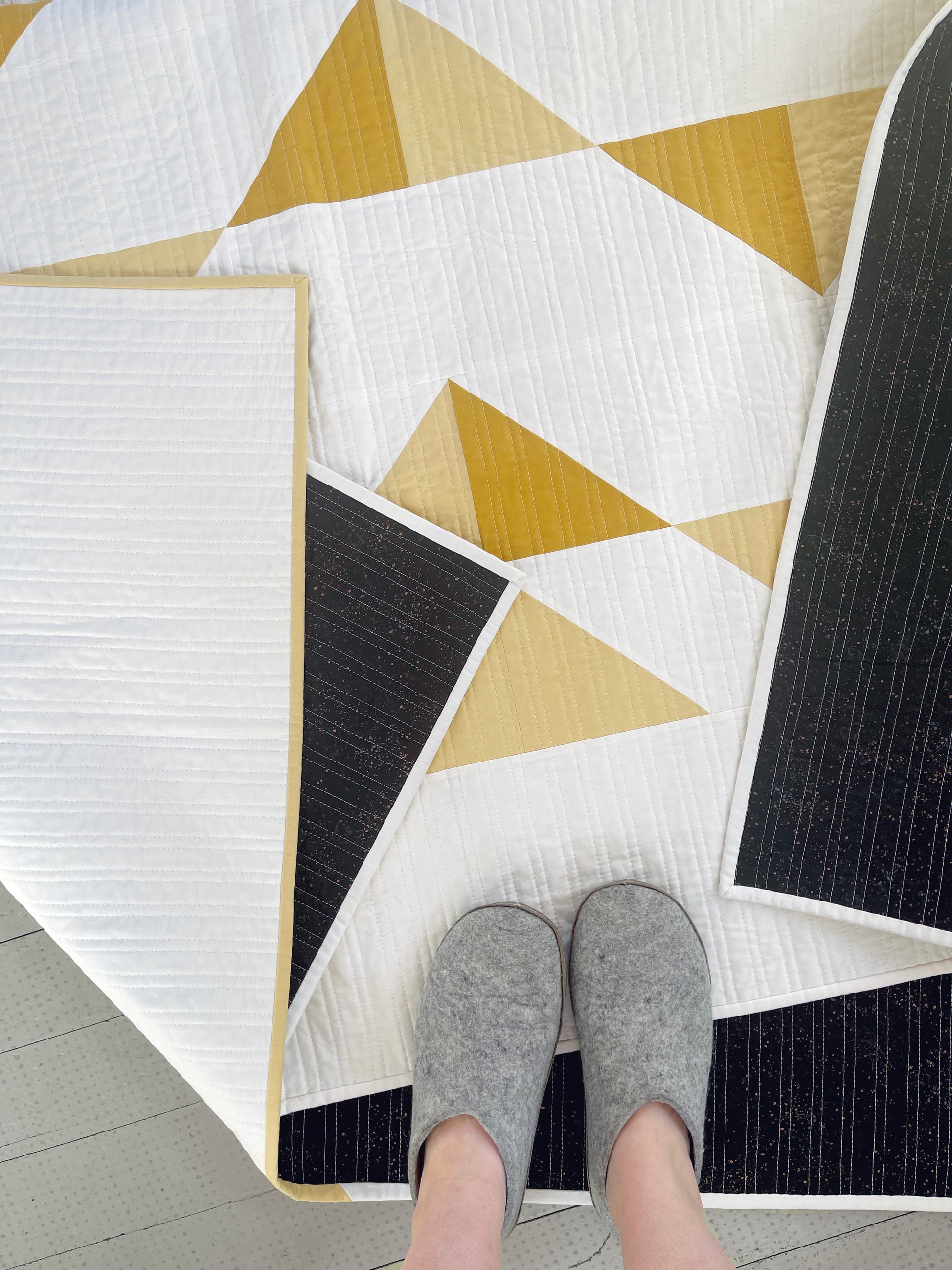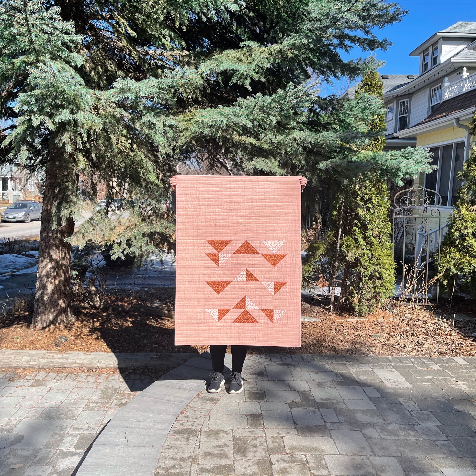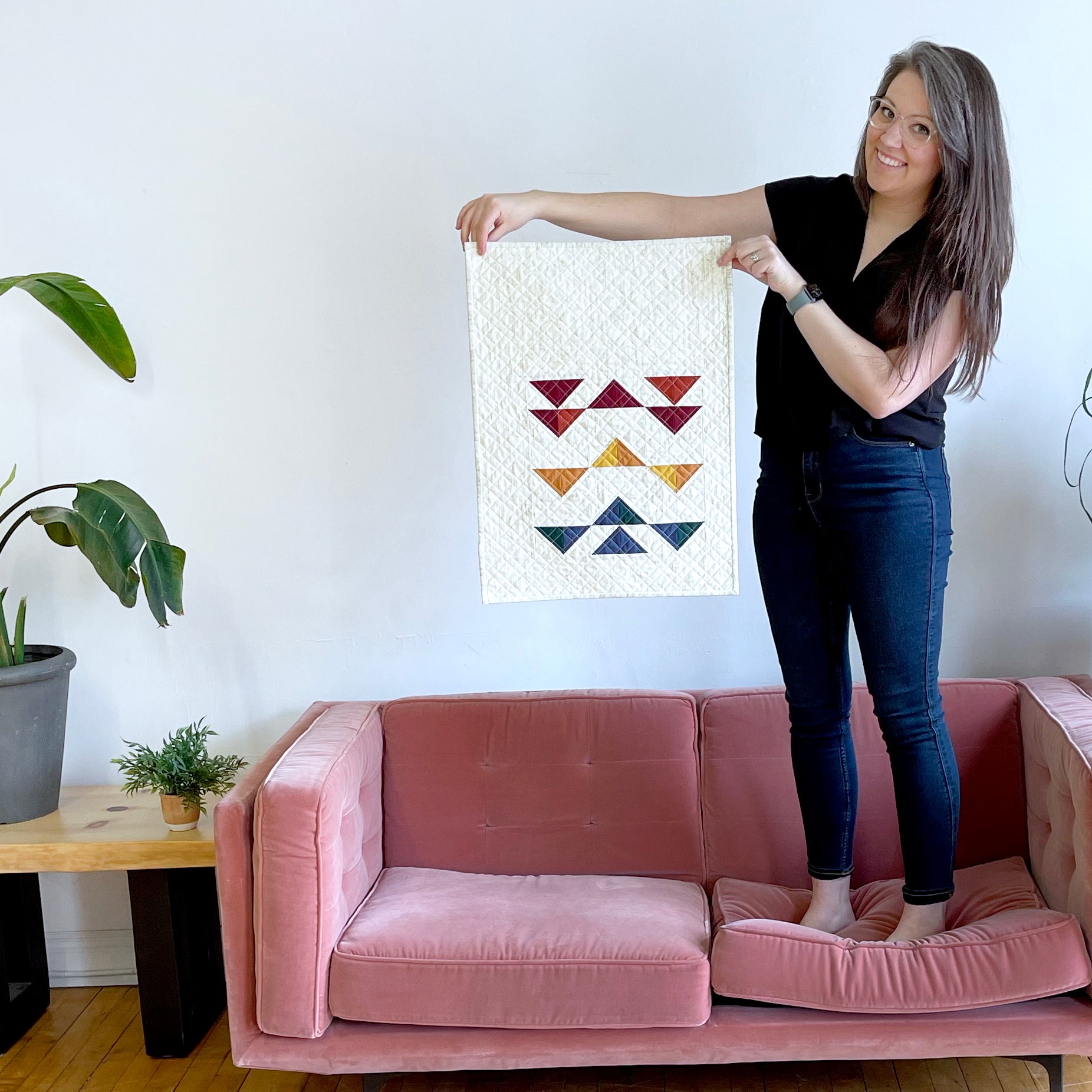 This modern, minimalist quilt pattern is appropriate for quilters of all skill levels and is a fast finish. This design draws its inspiration from the winter sun rising above the horizon over the snowy arctic. The pattern includes a 3-colour and 7-colour layout, with beginner friendly instructions for the following sizes: