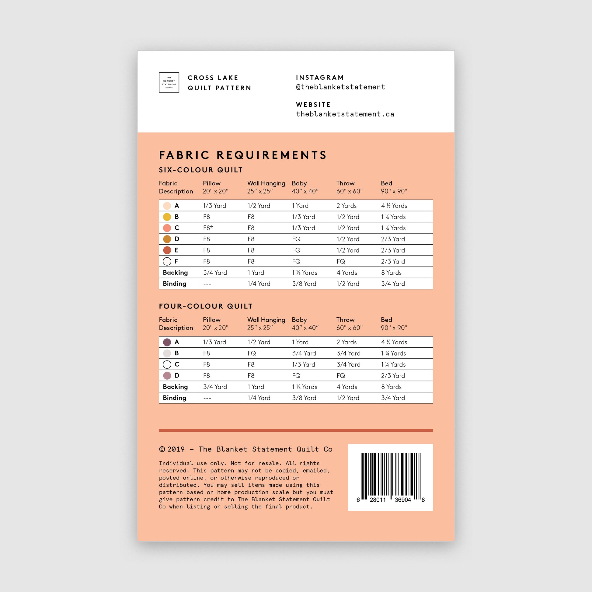 This modern original quilt pattern is appropriate for quilters of all skill levels and is a fast finish. The pattern includes both a 6-colour and 4-colour layout, as well as instructions for the following sizes: