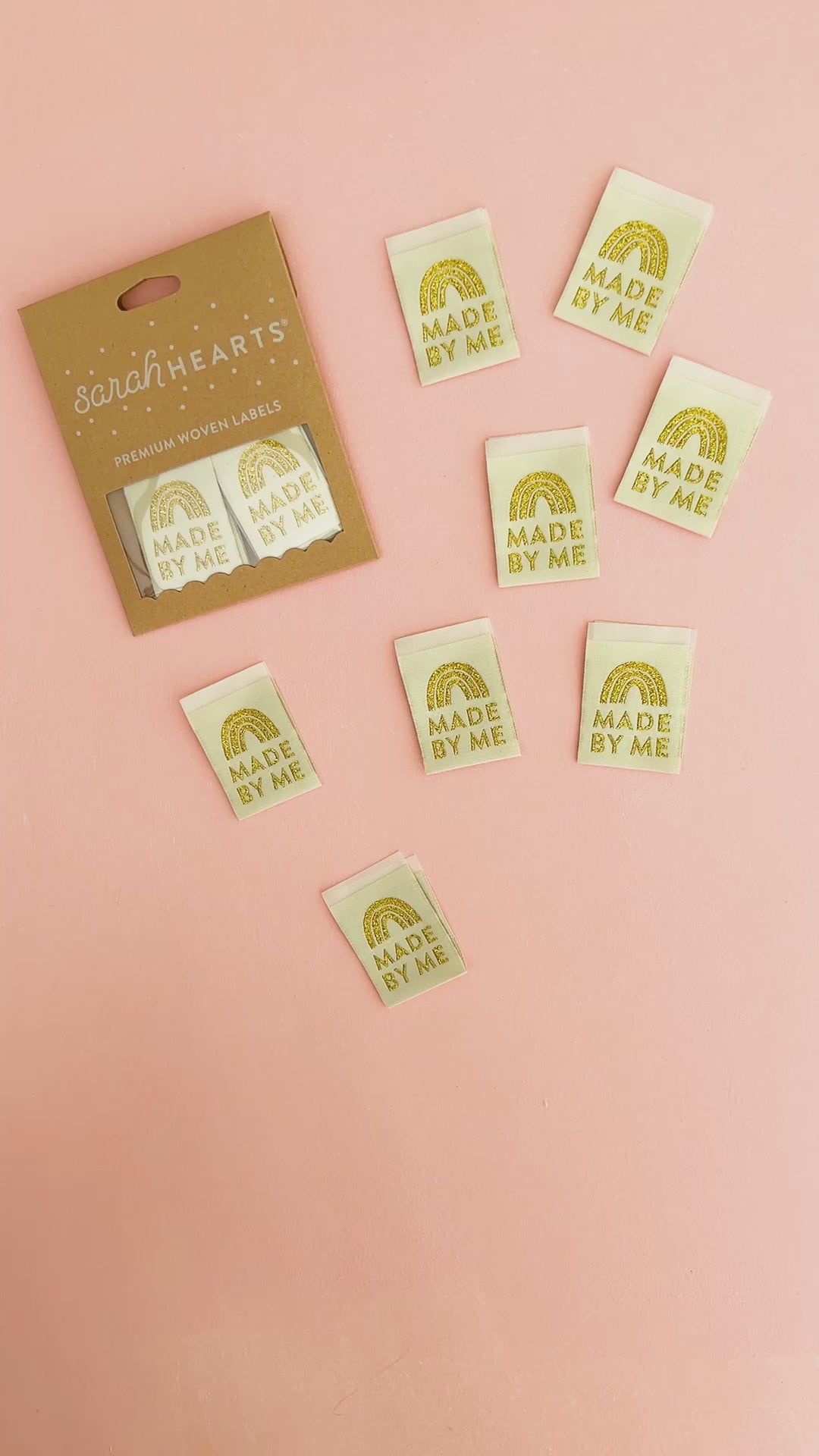 Sewing is magic and so are these labels! The labels feature "Made by Me" and an adorable rainbow in metallic gold thread on a cream background. The high-quality woven labels are fully washable and can handle the heat of the dryer.